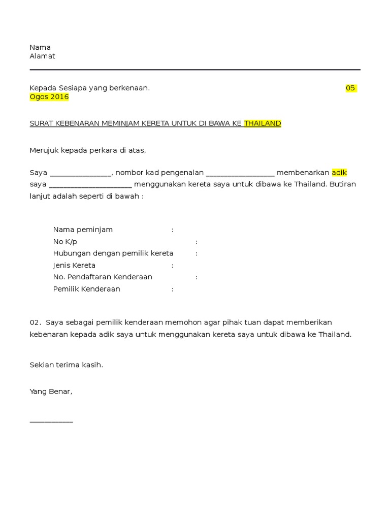 Tulis sendiri sudah cukup dan tidak perlu ayat berbunga-bunga. Surat Kebenaran Membawa Kenderaan 1. Surat Kebenaran Bawa Kenderaan Ke Thailand.